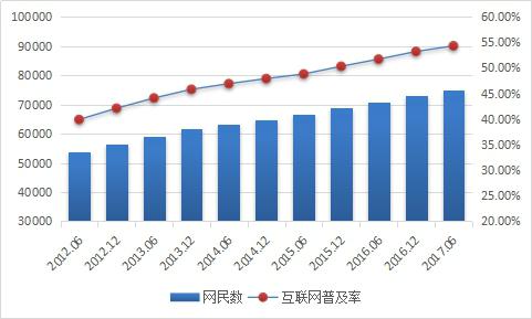根據(jù)CNNIC最新數(shù)據(jù)顯示,截止2017年6月,我國(guó)網(wǎng)民規(guī)模達(dá)到7.51億,半年共計(jì)新增網(wǎng)民1992萬(wàn)人?;ヂ?lián)網(wǎng)普及率為54.3%,較2016年底提升1.1個(gè)百分點(diǎn)。我國(guó)網(wǎng)民規(guī)模增長(zhǎng)趨于穩(wěn)定,互聯(lián)網(wǎng)行業(yè)持續(xù)穩(wěn)健發(fā)展,以互聯(lián)網(wǎng)為代表的數(shù)字技術(shù)正在加速與經(jīng)濟(jì)社會(huì)各領(lǐng)域深度融合,成為促進(jìn)我國(guó)消費(fèi)升級(jí)、經(jīng)濟(jì)社會(huì)轉(zhuǎn)型、構(gòu)建國(guó)家競(jìng)爭(zhēng)新優(yōu)勢(shì)的重要推動(dòng)力。