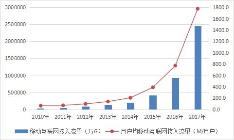 2010-2017年移動(dòng)互聯(lián)網(wǎng)流量發(fā)展情況比較