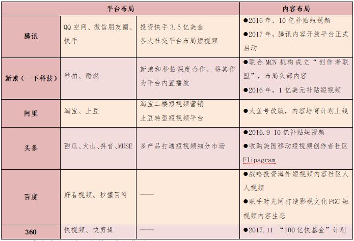 以BAT為首的機(jī)構(gòu)重金加速布局短視頻平臺(tái)。今日頭條、騰訊、秒拍等均投入10億元扶持短視頻內(nèi)容創(chuàng)業(yè)者。阿里投入20億元進(jìn)軍短視頻領(lǐng)域,將土豆網(wǎng)打造為專門(mén)的短視頻平臺(tái)。騰訊專門(mén)成立短視頻中心,負(fù)責(zé)短視頻平臺(tái)運(yùn)行;愛(ài)奇藝短視頻平臺(tái)的愛(ài)奇藝頭條正在內(nèi)測(cè);秒拍成為新浪微博獨(dú)家短視頻應(yīng)用,從工具型短視頻機(jī)構(gòu)轉(zhuǎn)型為社交分享類短視頻平臺(tái);華人文化基金領(lǐng)投的資訊類短視頻平臺(tái)梨視頻也已形成業(yè)內(nèi)影響力;咪咕視訊作為中國(guó)移動(dòng)在視頻領(lǐng)域的唯一版權(quán)運(yùn)營(yíng)實(shí)體,也布局短視頻,與中央電視臺(tái)共建業(yè)內(nèi)領(lǐng)先的短視頻創(chuàng)作者聚集平臺(tái),打造頭部賬號(hào)體系,孵化自有明星短視頻賬號(hào),引入知名工作室直接簽約,盤(pán)整已有的強(qiáng)IP資源賬號(hào)化運(yùn)作。