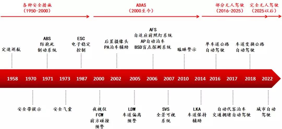 無人駕駛技術(shù)最初的發(fā)展從減少、防止機(jī)動(dòng)車事故開始。從1950年至2000年,OEM車廠和Tier 1的零部件制造商對(duì)車輛發(fā)明、生產(chǎn)了許多結(jié)構(gòu)性的改進(jìn)。最核心的就是四大安全系統(tǒng):安全帶,防抱死制動(dòng)系統(tǒng)(ABS),安全氣囊和電子穩(wěn)定控制(ESC)。