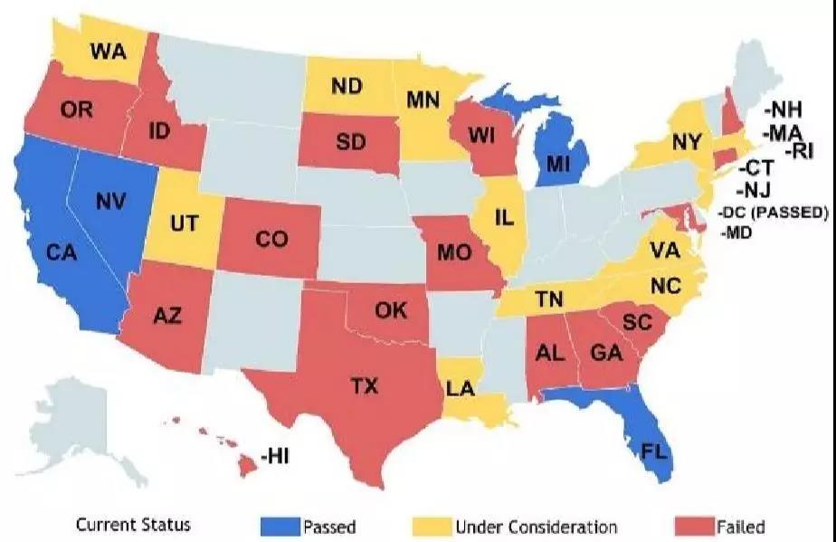 隨著無人駕駛技術(shù)的不斷發(fā)展演進(jìn),對(duì)無人駕駛的立法變得十分重要。截至2015年,美國(guó)已經(jīng)有16個(gè)州啟動(dòng)無人駕駛立法;截至2014 年是12個(gè)州,截至2013年是9個(gè)州,截至2012年是6個(gè)州。Nevada 在2011年授權(quán)無人駕駛車的運(yùn)營(yíng),是全美第一個(gè)授權(quán)無人駕駛的州。之后,California,F(xiàn)lorida,Michigan,North Dakota,Tennessee和 Washington D.C 針對(duì)無人駕駛通過了相關(guān)的法案。Arizona州長(zhǎng)簽署了無人駕駛的行政命令。