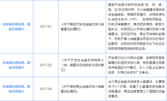 2016年以來,國家發(fā)改委、住建部聯(lián)合多個(gè)銀行出臺多項(xiàng)支持特色小鎮(zhèn)建設(shè)的政策文件及金融支持文件。