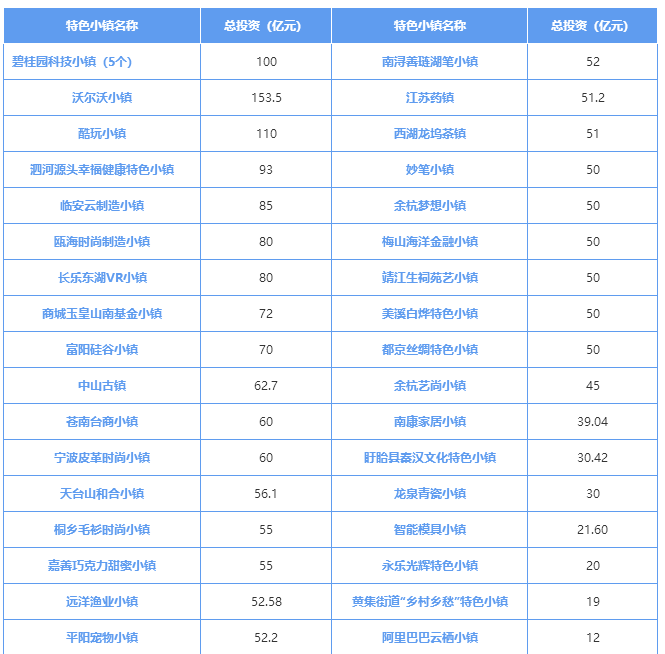 部分有代表性的特色小鎮(zhèn)投資情況