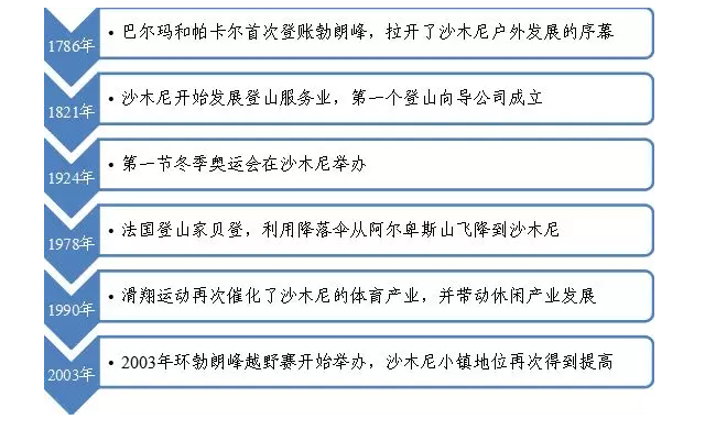 沙木尼的作為特色小鎮(zhèn)的最初起源,來自1786年8月當(dāng)?shù)孬C人巴爾瑪和醫(yī)生帕卡爾兩人首次登上勃朗峰;1821年開始,沙木尼開始發(fā)展登山服務(wù)業(yè),小鎮(zhèn)內(nèi)34名的本地向?qū)ЫM成了一個(gè)向?qū)Ч荆?924年第一屆冬季奧運(yùn)會在沙木尼舉辦,世界性的滑雪教練訓(xùn)練中心也在這里落戶。至此,沙木尼的特色小鎮(zhèn)地位已經(jīng)基本
