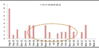 先看祖代存欄情況,我們對于引種量與存欄量之間做出三種情形分析:1)正常的產(chǎn)蛋周期,基本上從引種到淘汰約15個月,則16年3月份開始的引種逐漸進(jìn)入淘汰期;2)淡季換羽,即在換羽時的雞價一般,通常在50周左右換羽,最終淘汰約在18個月,因此15年12月份開始的引種逐步進(jìn)入淘汰期;3)旺季換羽,即在換羽時雞價較高,通常在第一產(chǎn)蛋周期結(jié)束后才做換羽,最終淘汰約在21個月,所以15年9月份開始的引種逐步進(jìn)入淘汰期。