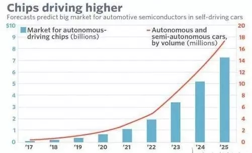 以無人駕駛汽車的智能化趨勢(shì)為例,摩根大通估計(jì)到2025年,用于無人駕駛汽車的半導(dǎo)體器件銷售額可達(dá)73億美元,從2017年到2025年的年復(fù)合增長率高達(dá)62.5%。2015年全球汽車半導(dǎo)體總銷售額不過300億美元,摩根估計(jì)平均每部車用到的芯片價(jià)值將從現(xiàn)在的300至400美元增長到2025年400至500美元。