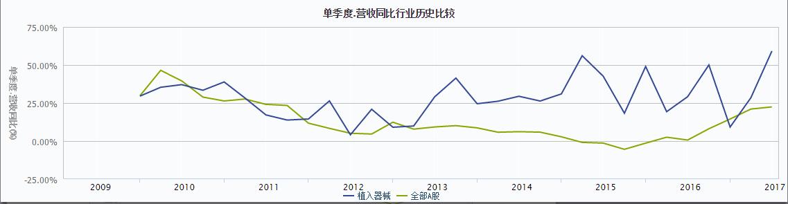 根據(jù)與全部A股營(yíng)收相比較,在2012年之前,植入器械的營(yíng)收總體上與全部A股的保持一致。2012年之后,全部A股的營(yíng)收變動(dòng)相對(duì)平緩;而植入器械行業(yè)營(yíng)收基本高于全部A股營(yíng)收,在2016年經(jīng)歷谷值之后,行業(yè)保持增長(zhǎng)的趨勢(shì)。