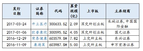 從2016年8月17日至2017年8月17日,植入器械行業(yè)上市公司股權(quán)融資主要有開立醫(yī)療、歐普康視、榮泰健康、康德萊,分別是深交所創(chuàng)業(yè)板、上交所主板的上市公司,通過(guò)IPO方式融資,募資規(guī)模分別為2.09億元、4.05億元、7.82億元、5.00億元。