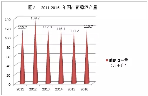 據(jù)國(guó)家統(tǒng)計(jì)局統(tǒng)計(jì),2011年-2016年國(guó)產(chǎn)葡萄酒產(chǎn)量見圖2。2012年底,我國(guó)規(guī)模以上葡萄酒企業(yè)(指年銷售額在2000萬元以上的企業(yè))的葡萄酒產(chǎn)量達(dá)到138.16萬千升,平均每五年翻一番,較2002年產(chǎn)量復(fù)合增長(zhǎng)率為16.98%。2013年,由于消費(fèi)市場(chǎng)的改變以及進(jìn)口葡萄酒持續(xù)沖擊的影響,我國(guó)葡萄酒行業(yè)景氣度下滑,產(chǎn)量降至117.8萬千升,隨后兩年產(chǎn)量持續(xù)下降;2014年、2015年產(chǎn)量分別降至116.1萬千升和111.2萬千升;2016年,行業(yè)發(fā)展?fàn)顩r稍有回暖,產(chǎn)量增加了2.24%至113.7萬千升。2007年1-5月,國(guó)內(nèi)葡萄酒產(chǎn)量同比增長(zhǎng)15.3%。