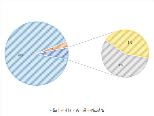 晶硅太陽能電池約占市場份額90%;薄膜太陽能電池占市場份額約10%,其中碲化鎘市場份額約4%,銅銦鎵硒約占市場份額3%。其他薄膜電池如軍工領域應用較多的砷化鎵、目前無法規(guī)?;拟}鈦礦等太陽能電池占市場份額約3%。碲化鎘目前90%的市場由美國薄膜電池制造商First Solar壟斷。