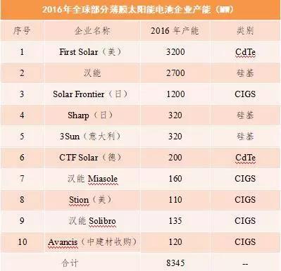從企業(yè)看,全球薄膜電池產(chǎn)量主要集中在以CdTe電池為代表的FirstSolar,以CIGS電池為代表的SolarFrontier和以硅基薄膜為代表的漢能控股公司。