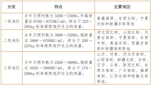 太陽能資源的分布與各地的緯度、海拔高度、自然地理狀況和氣候條件有關(guān)。我國屬太陽能資源豐富的國家之一,全國總面積2/3以上地區(qū)年日照時數(shù)大于2000h,根據(jù)中國氣象局風能太陽能評估中心推薦的國內(nèi)太陽能資源地區(qū)分類辦法,共分5類,其中: