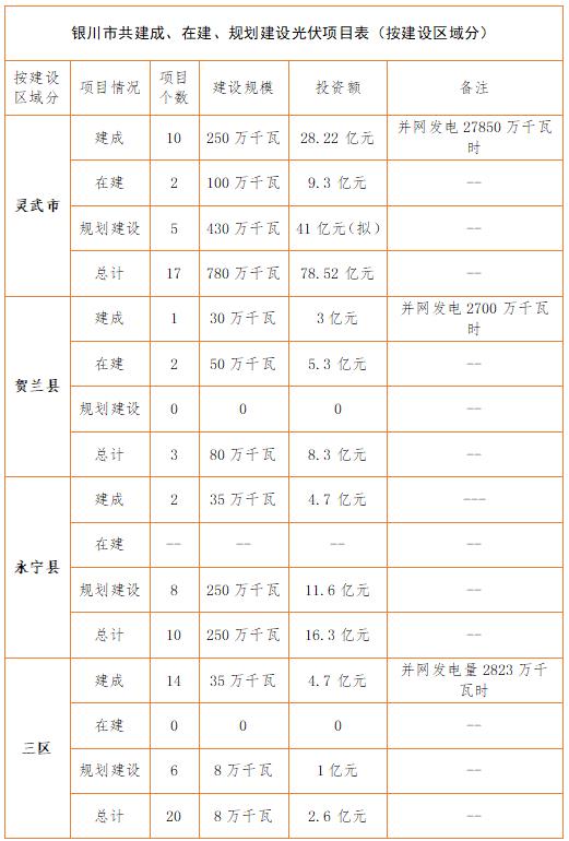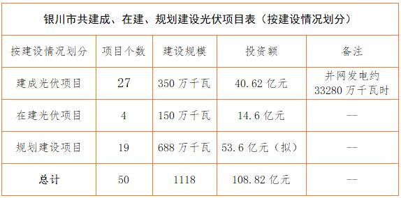 銀川市發(fā)改委項目資料顯示情況:截止2017年上半年,銀川市共建成、在建、規(guī)劃建設光伏項目50個,建設規(guī)模1118萬千瓦,投資約108.82億元。