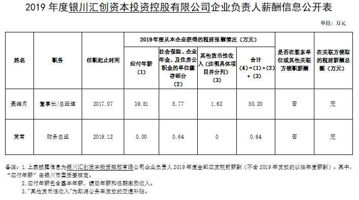 按照《銀川市屬?lài)?guó)有企業(yè)負(fù)責(zé)人薪酬管理辦法(試行)》(銀國(guó)資發(fā)〔2021〕458號(hào))規(guī)定,經(jīng)銀川市國(guó)資委核定,現(xiàn)將銀川匯創(chuàng)資本投資控股有限公司企業(yè)負(fù)責(zé)人2019年度薪酬信息予以披露。