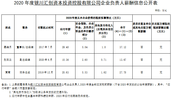 按照《銀川市屬國有企業(yè)負責人薪酬管理辦法(試行)》(銀國資發(fā)〔2021〕458號)規(guī)定,經(jīng)銀川市國資委核定,現(xiàn)將銀川匯創(chuàng)資本投資控股有限公司企業(yè)負責人2020年度薪酬信息予以披露。